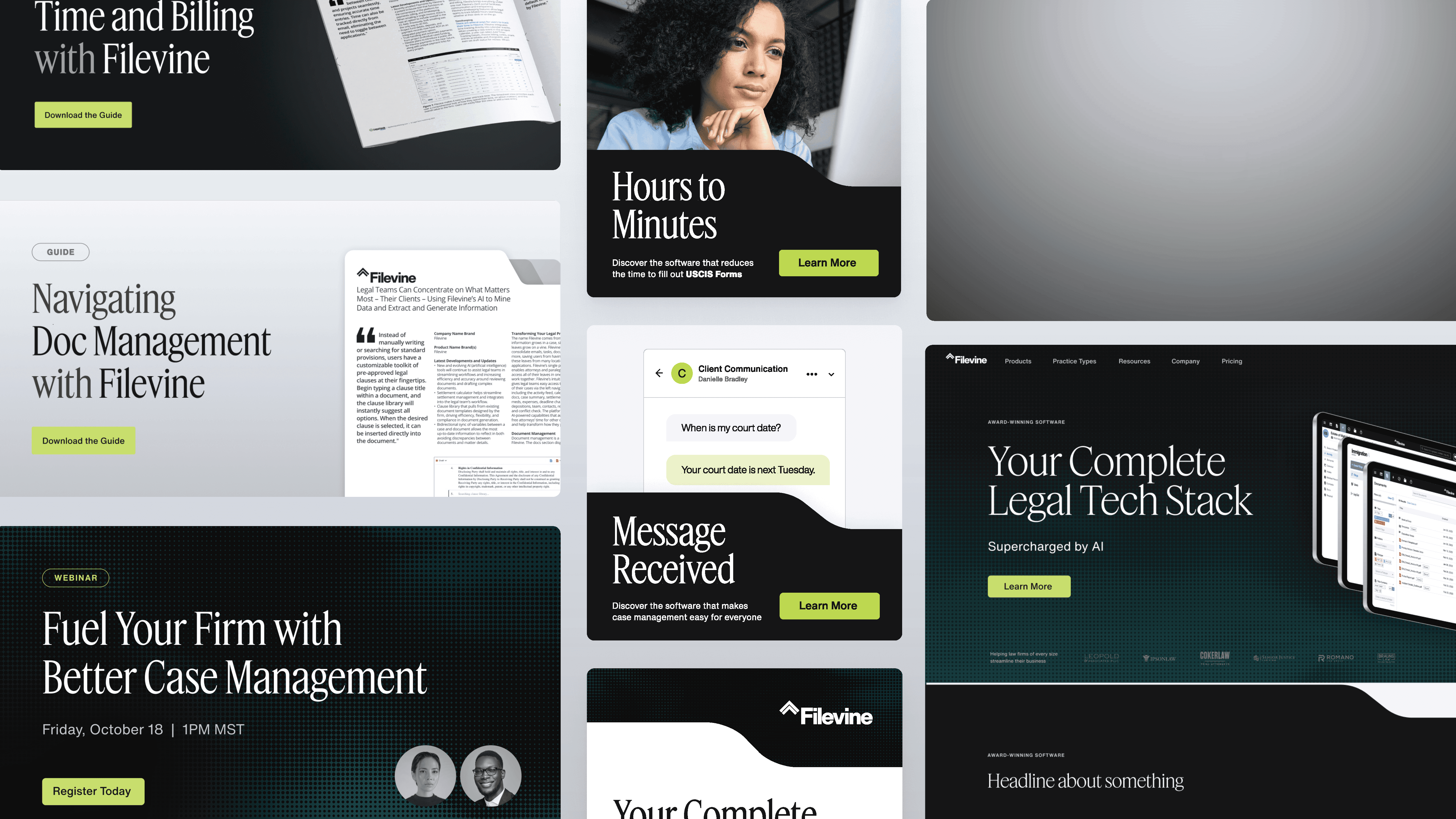 When I joined the team at filevine, I brought some motion design experience so the marketing team wanted to utilize that. We created a multitude of video ads including a timesquare billboard, Utah Jazz sponsorships, and Hulu advertisements.